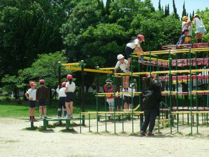 たてわり班でオリエンテーリングをしたり、広場で鬼ごっこをしたり、遊具で遊んだりしました。