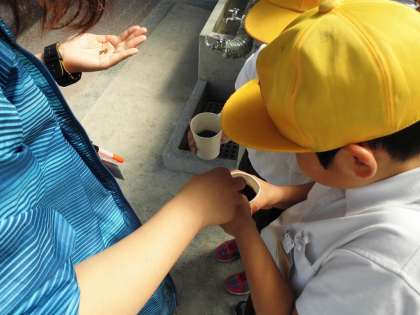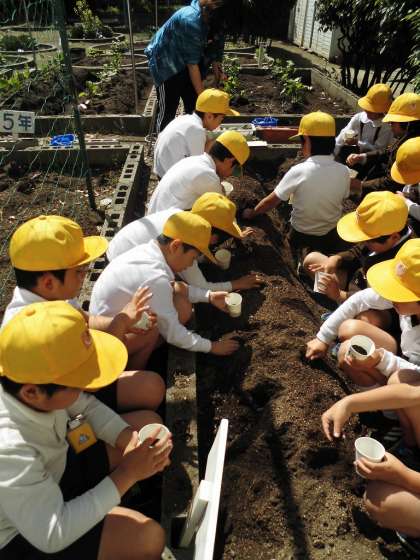 3年1学期の理科では植物や昆虫について学習します。今日は、植物の学習のためにホウセンカの種を紙コップの中の土にまきました。一人一つの紙コップで成長の様子を観察します。また、昆虫の学習では、モンシロチョウやアゲハチョウの卵や幼虫を学習園でさがしました。卵も幼虫も見つかり、これから学級で成長の様子を観察していきます。