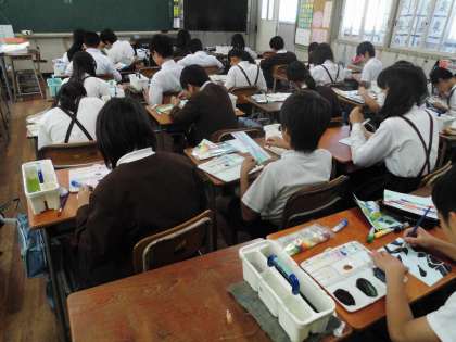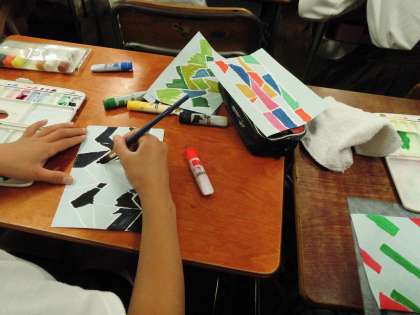 図工で「色いろいろ」という学習をしました。自分で書いた模様の上に原色や混色で着色していきます。集中してていねいに取り組む様子が伝わってきました。