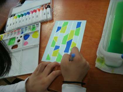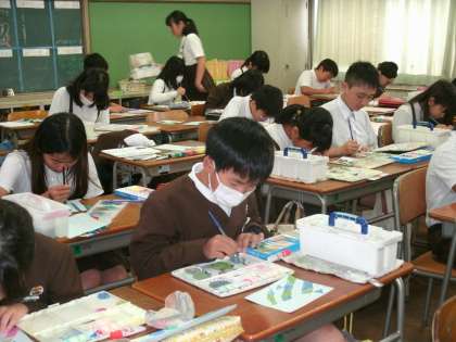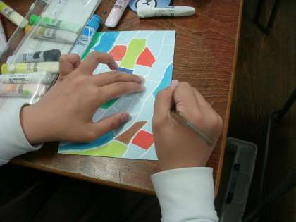 6年生は、図画工作の学習をしていました。「色いろいろ」という作品を仕上げていました。原色に白、灰色、黒を混ぜていろいろな色をつくりだしていました。