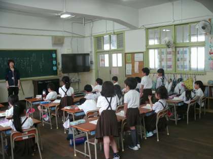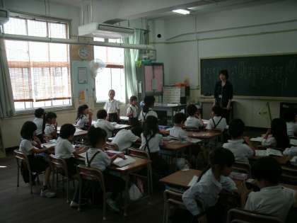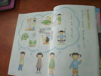 1年2組は、国語の学習をしていました。「みつけたものを友だちに話しましょう」学校の中ではどんなものをみつけましたか。学校の外ではどんなものをみつけましたか。ともだちにわかりやすく話しましょう。