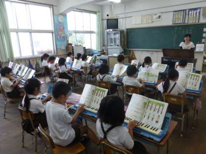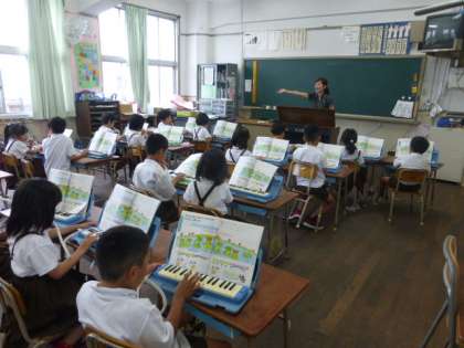 2年生は、音楽の時間にけんばんハーモニカで「かっこう」「かえるのうた」をひいていました。