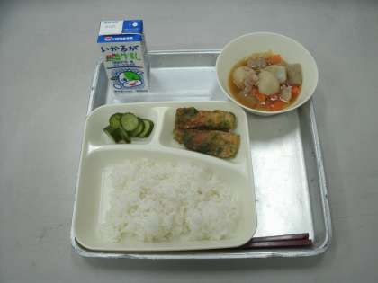 今日の給食は、ちくわのいそべあげ、鶏肉とさといもの煮もの、あっさりきゅうり、ごはん、牛乳です。