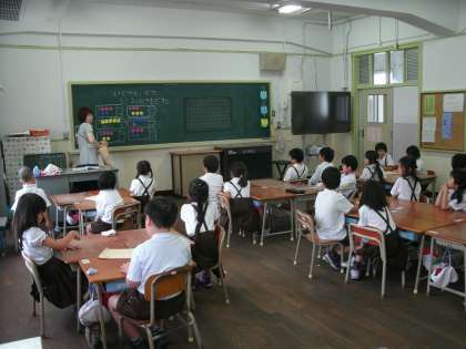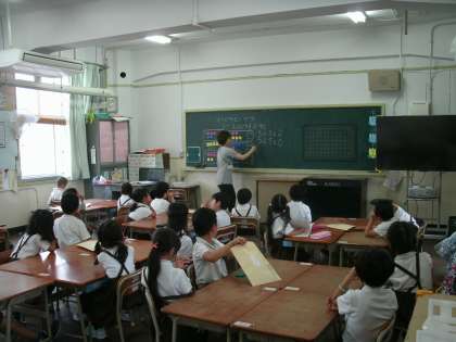 1年2組は、算数の学習をしていました。封筒に2色のおはじきが入っています。中を見ないで5個のおはじきを取り出します。取り出した5個のおはじきの色は…