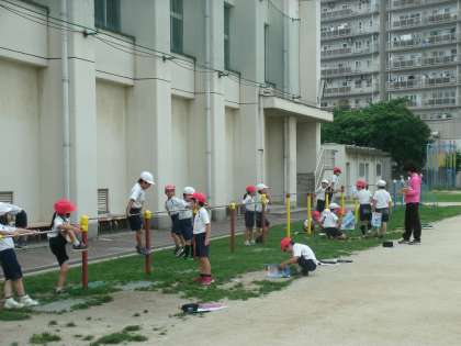 2年1組は、運動場で体育の学習をしていました。副読本を参考にして鉄棒の技を練習していました。