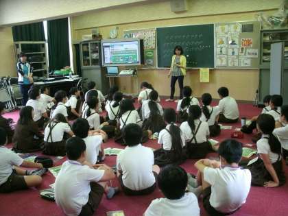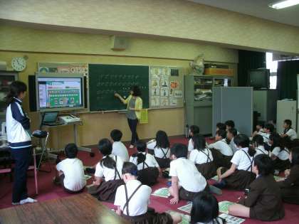 6年生は、多目的室で外国語活動をしていました。C-NETの先生について発音の練習をしていました。