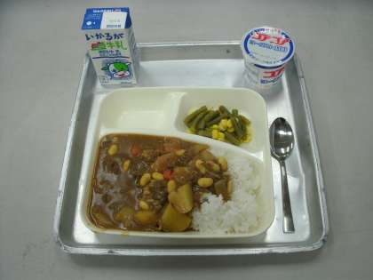 今日の給食は、牛肉と大豆のカレーライス、三度豆とコーンのサラダ、ヨーグルト、牛乳です。