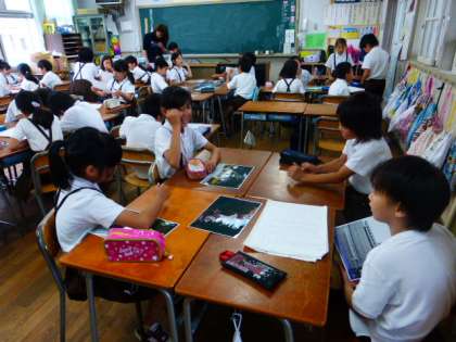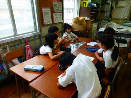 3年生は、社会科の時間に、グループで「町たんけん」の発表の準備をしていました。