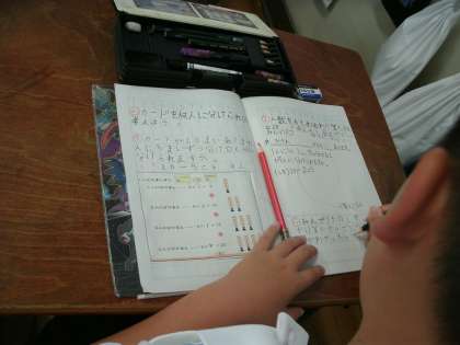 3年2組は、算数の学習をしていました。20枚のカードを5枚ずつ分けると何人に分けられるか考えていました。学習を終えて、ふり返りを書いているところです。