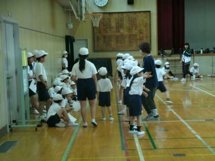 1年生は、講堂で新体力診断テストをしていました。6年生の児童が優しくサポートしていました。6年生の児童にわかりやすく教えてもらい1年生の児童は伸び伸びとテストをうけていました。シャトルランと反復横跳びをしているところです。