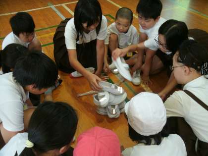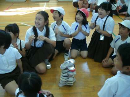毎週木曜日の朝は児童集会が行われます。今日は、集会委員会のメンバー紹介のあと、たてわり班で「うわぐつ積み競争」をしました。