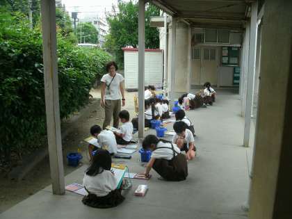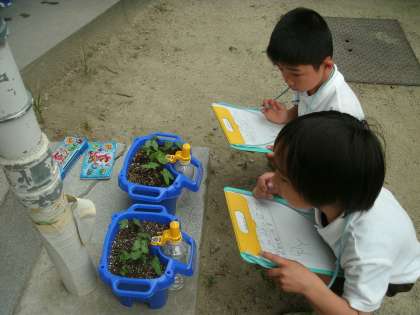 1年1組は、生活科の学習をしていました。学習園でアサガオの双葉の観察をしていました。