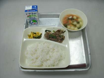 今日の給食は、プルコギ、チンゲンサイとコーンの甘酢あえ、とうふのスープ、ごはん、牛乳です。