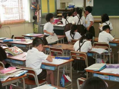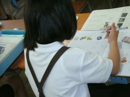 1年1組は、ひらがなの練習をしていました。「わ」「れ」「ね」など形のにているひらがなを間違えないように、しっかりと覚えていました。練習帳を書き終えると担任の先生にチェックしてもらいます。