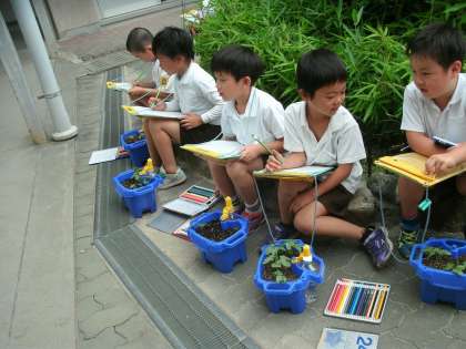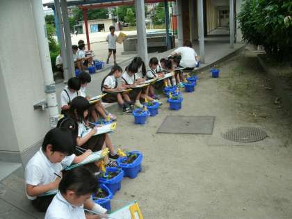 1年2組は、生活科の学習をしていました。学習園でアサガオの双葉の観察をしていました。
