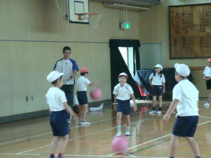 3年生は、体育館でボール運動をしていました。「プレルボール」というゲームです。ボールをワンバウンドさせてパスをする練習をしていました。