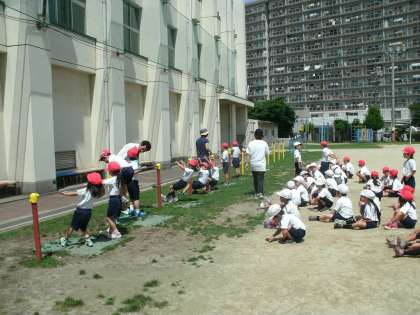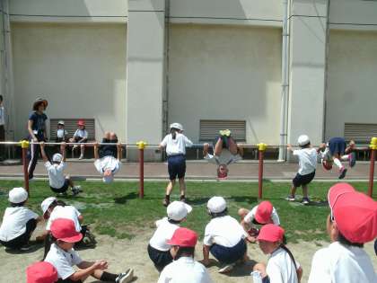 1年生は、運動場で鉄棒の練習をしていました。教頭先生のきれいな前回りにみんな見とれていました。「ひとりできれいに回れた。」とうれしそうに話してくれる子も、「まだ一人では上手に回れない。」とくやしそうな子も、一生懸命練習していました。