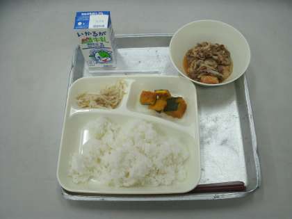 今日の給食は、すき焼き煮、焼きかぼちゃの甘みつかけ、もやしのごま酢あえ、ごはん、牛乳です。