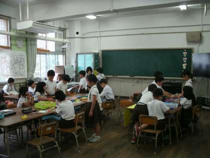 2年1組は、いそじウキウキランドの準備物をグループで協力して作成していました。