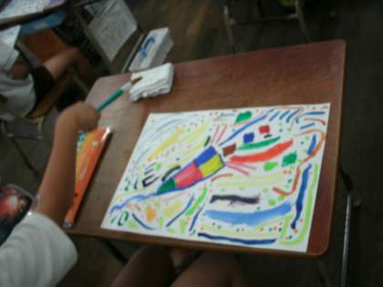 2年2組は、図画工作の学習をしていました。クラッカーがパーンとはじけた様子を表していました。