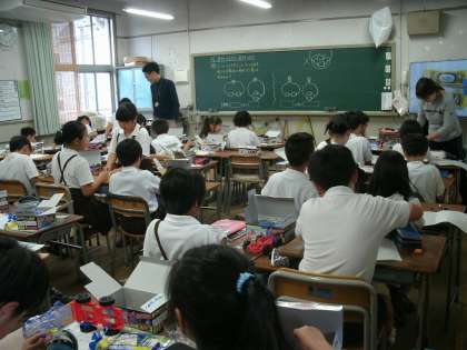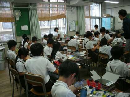 4年生は、理科の学習をしていました。直列つなぎと並列つなぎについて調べていました。2つのつなぎ方でモーターの回る速さや豆電球の明るさに差は出るのか実験していました。