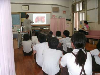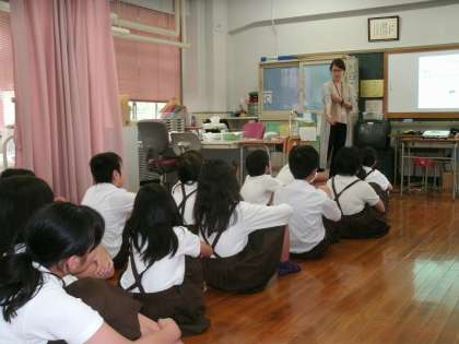 6年生は、保健室で保健指導を受けていました。「プール熱の予防について」保健の先生から話を聴いていました。