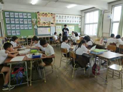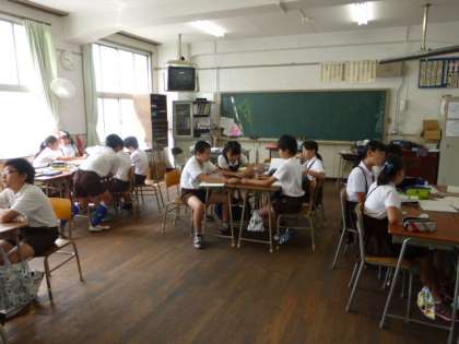 6年生は、図画工作の時間に「ピタゴラ装置を作ろう」という単元で、グループで作るものについて相談していました。