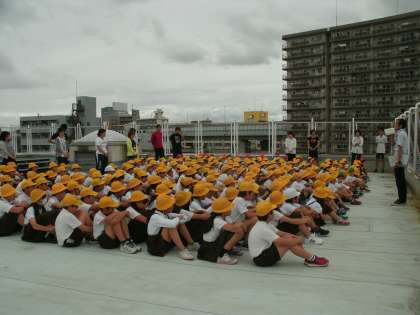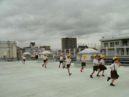 次に、津波からの避難として講堂の屋上に避難しました。1年生にとっては、初めての経験です。磯路保育所との連携(5歳児対象)を予定していましたが、天候が不安定だったため先生のみ2名の参加となりました。