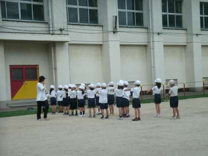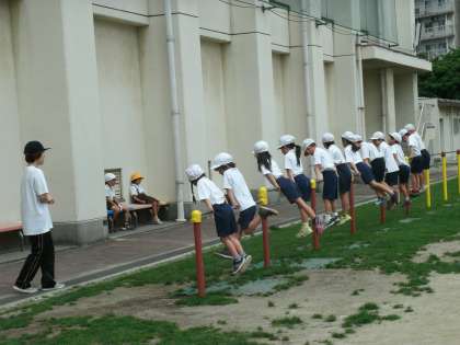 1年2組は、運動場で体育の学習をしていました。鉄棒の練習をしているところでした。