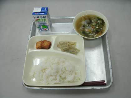 今日の給食は、いわしの天ぷら、五目汁、厚揚げのしょうがじょうゆかけ、ごはん、牛乳です。