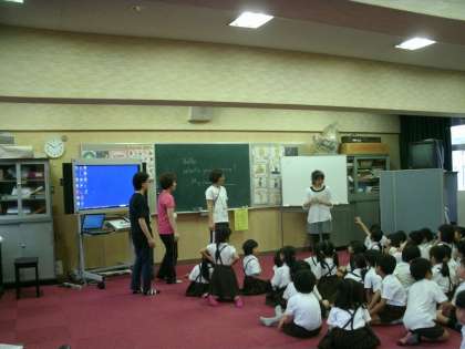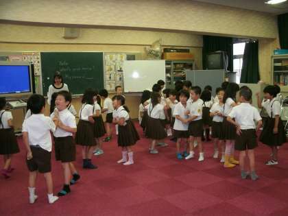 1年生は、多目的室で外国語活動をしていました。英語で楽しそうにじゃんけんゲームをしていました。