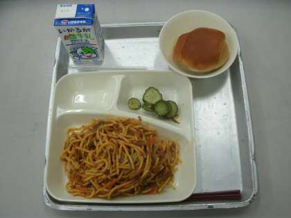 今日の給食は、スパゲッティミートソース、きゅうりのバジル風味サラダ、黒糖クレセントロールパン、牛乳です。