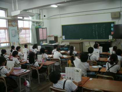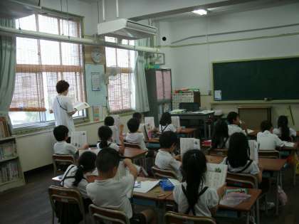 1年2組は、国語の学習をしていました。「は」「へ」「を」を使う文を練習していました。