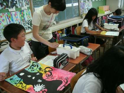 6年生は、図画工作をしていました。「夕焼け空の木」を描いていました。黒い木の上に白色で人や家を描き加えていました。