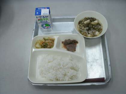 給食のもずくは、沖縄県でとれたもので、今日は「とろり汁」に入っています。