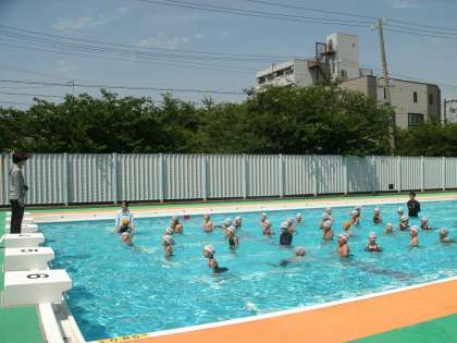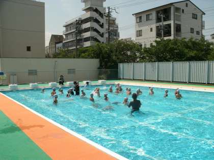 2年生は、2時間目にプールに入りました。水中で「にらめっこ」をしているところです。