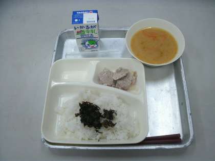 今日の給食は、豚肉のゆずの香焼き、みそ汁、のりのつくだ煮、ごはん、牛乳です。