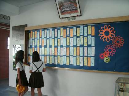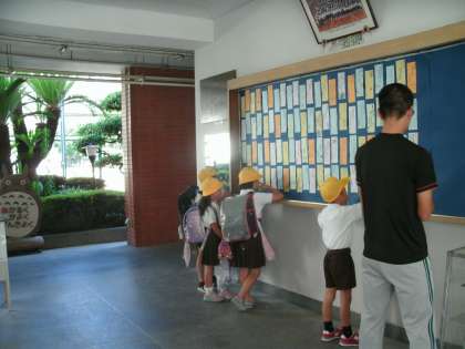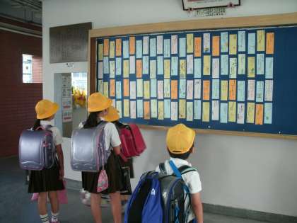 7月に入り、玄関掲示がかわりました。短冊に書かれた3年生の俳句が掲示してあります。登校してきた児童が立ち止まって読んでいます。