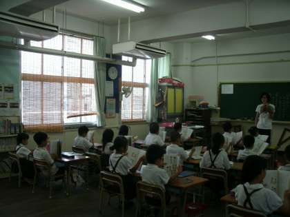 1年1組は、国語の学習をしていました。教科書の「こんなことしたよ」を音読した後、原稿用紙に自分の「こんなことしたよ」を書き始めていました。