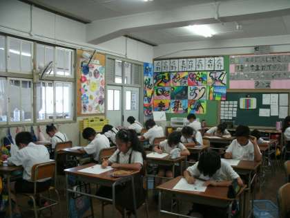 5年2組は、算数のテストを始めるところでした。「小数のわり算」のテストです。