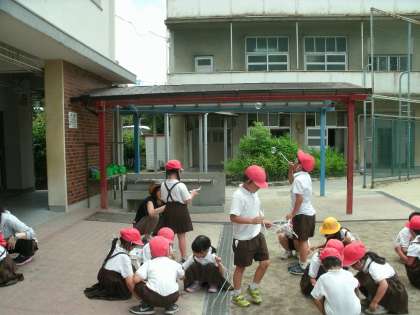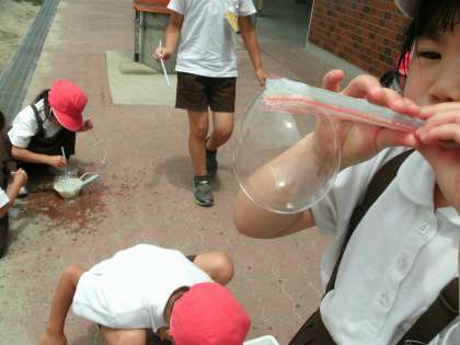 1年1組は、シャボン玉をとばしていました。ストローを工夫して大きなしゃぼん玉を作ったり、たくさん飛ばしたりして楽しんでいました。