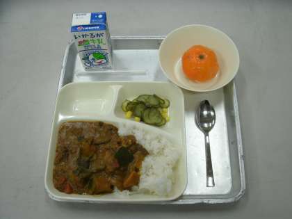 今日の給食は、夏野菜のカレーライス、きゅうりとコーンのサラダ、みかん(冷)、牛乳です。