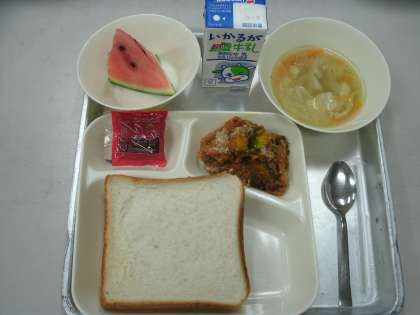 今日の給食は、かぼちゃのミートグラタン、スープ、すいか、食パン、牛乳です。