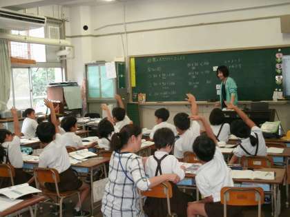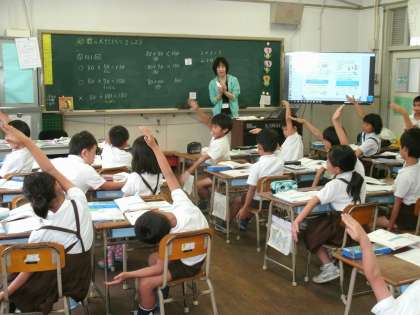 2年1組は、算数の学習をしていました。数の大きさ比べをしていました。どちらの数字が大きいか、体で不等号を表現しているところです。