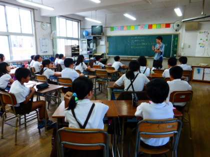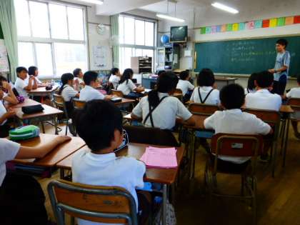 今日は、全校で不審者対策の避難訓練をしました。事前に先生から話を聞いているところです。