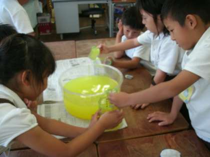 デシリットルますとリットルますを使って色水のかさをはかっていました。