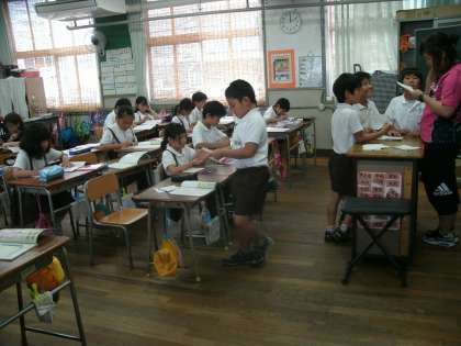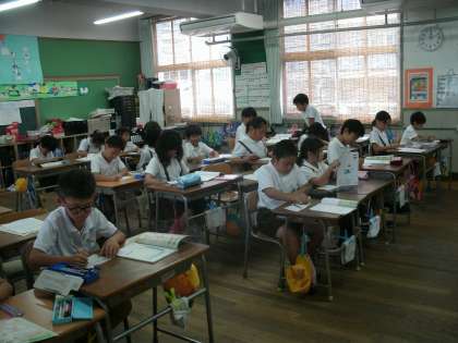 3年2組は、算数の学習をしていました。「みんなプリント」をしていました。自分たちで考えた問題を担任の先生が印刷しみんなで解いていきます。作った問題をチェックしているところです。