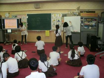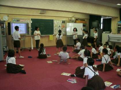 5年1組は、多目的室で外国語活動をしていました。先生の質問に対して「I like 〜 」と答えてからカードの番号を言い、めくるとポイントが加算されるゲームをしていました。