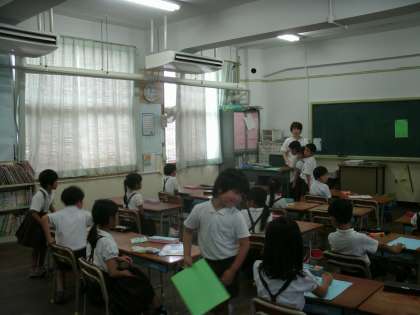 1年2組は、「あさがおのかんさつ」ファイルの表紙を色画用紙で作っているところでした。