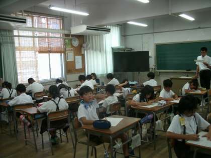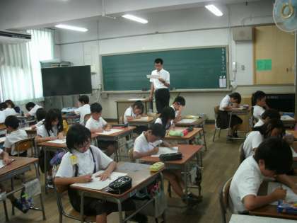 3年1組は、国語のしんだんをしていました。聞き取り問題の文章を担任の先生が読み上げているところでした。集中して聞いていました。